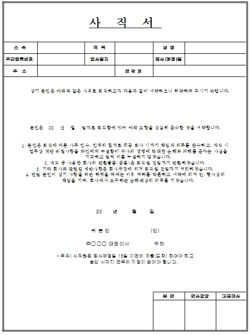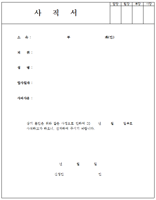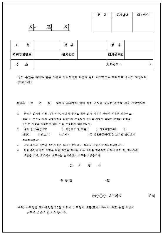 여기까지 권고 사직서 양식을 3종의 파일로 엑셀, 워드, 한글로 공유를 하니 필요한 분들은 이용해 보시기 바랍니다.