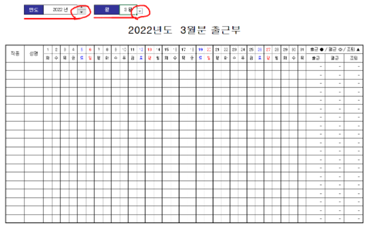 다운 받아서 살펴 보시면 출근부 양식 파일에 2022년도를 선택하고 월을 선택하면 해당 월이 나오므로 하나씩 하나씩 저장하시면 됩니다. 인쇄를 해서 펜으로 체크하며 사용을 해도되고, 담당자를 지정해서 한명이 작성을 해도 되는 출근부양식 입니다. 아마 다른 출근부 서식들 보다는 사용하기 훨씬 편리 하실 거에요. 아래 공유되는 출근부 양식 스샷을 올려 봅니다.